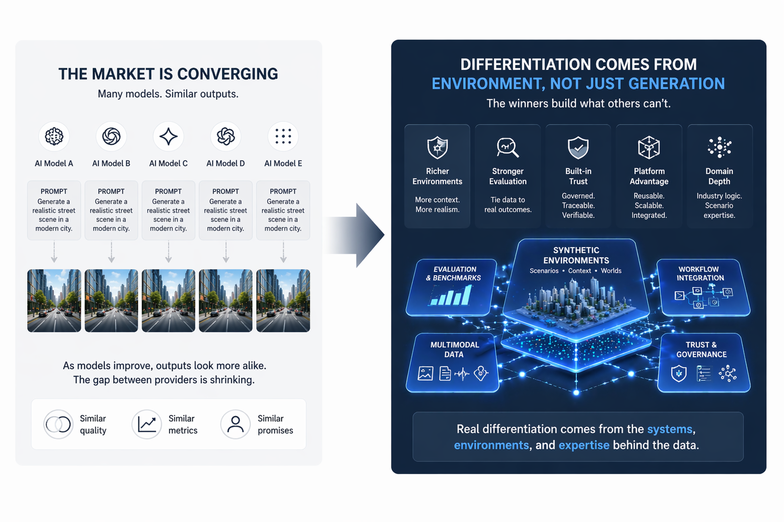 It is also becoming strategically important from a business perspective. As model access becomes easier and competition intensifies, data is becoming one of the few defensible layers in the AI stack. A company's ability to generate domain-specific scenarios, create private evaluation benchmarks, simulate edge cases, and continuously refine its training environment can become a meaningful source of competitive advantage. Unlike off-the-shelf models, these capabilities are deeply tied to internal know-how, workflows, and infrastructure. They are harder to copy and easier to compound over time.